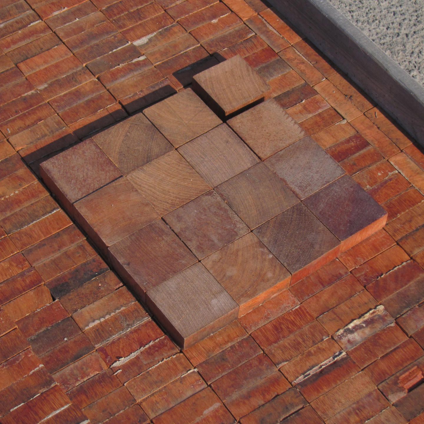 But that's not the end of the story! The material we received presented glue and cement residue on the back of each piece of wood. With 204 blocks in a single square metre, this was a real barrier to reuse. After some trial and error, we found a way to remove this residue semi-automatically. Helped by workers from adapted company Travie, we are now treating the thousands of Afzelia blocks to make them ready for reuse. We can't wait to see what projects will be created with this fantastic material!