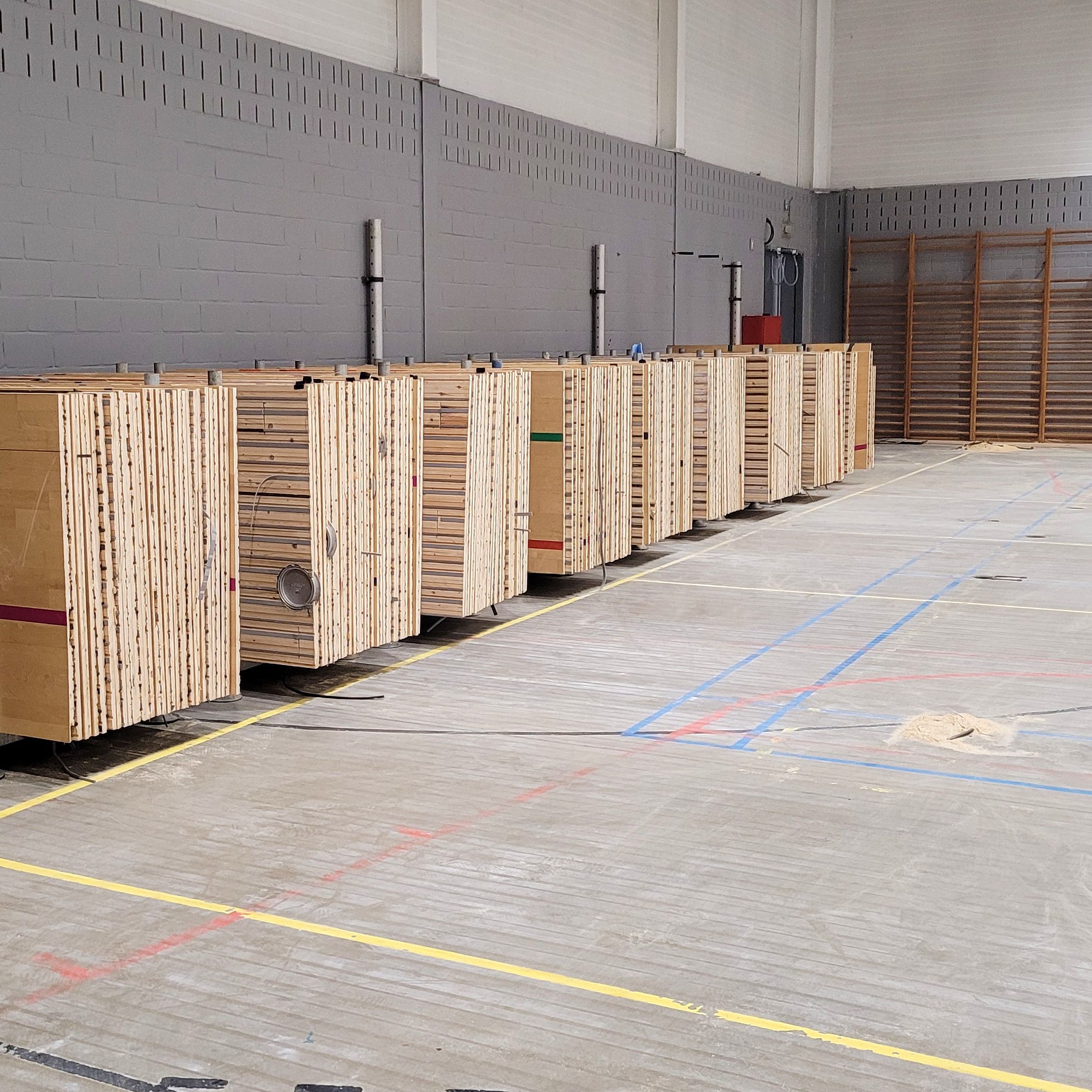 We had the opportunity to reclaim another gymnasium floor – this time in Laakdal. Our team used the same method as before, coming equipped with circular saws to divide the floor into rectangular panels. Although there is no underlying structure, the panels remain coherent once cut because the boards were originally glued together at their tongue-and-groove joints.