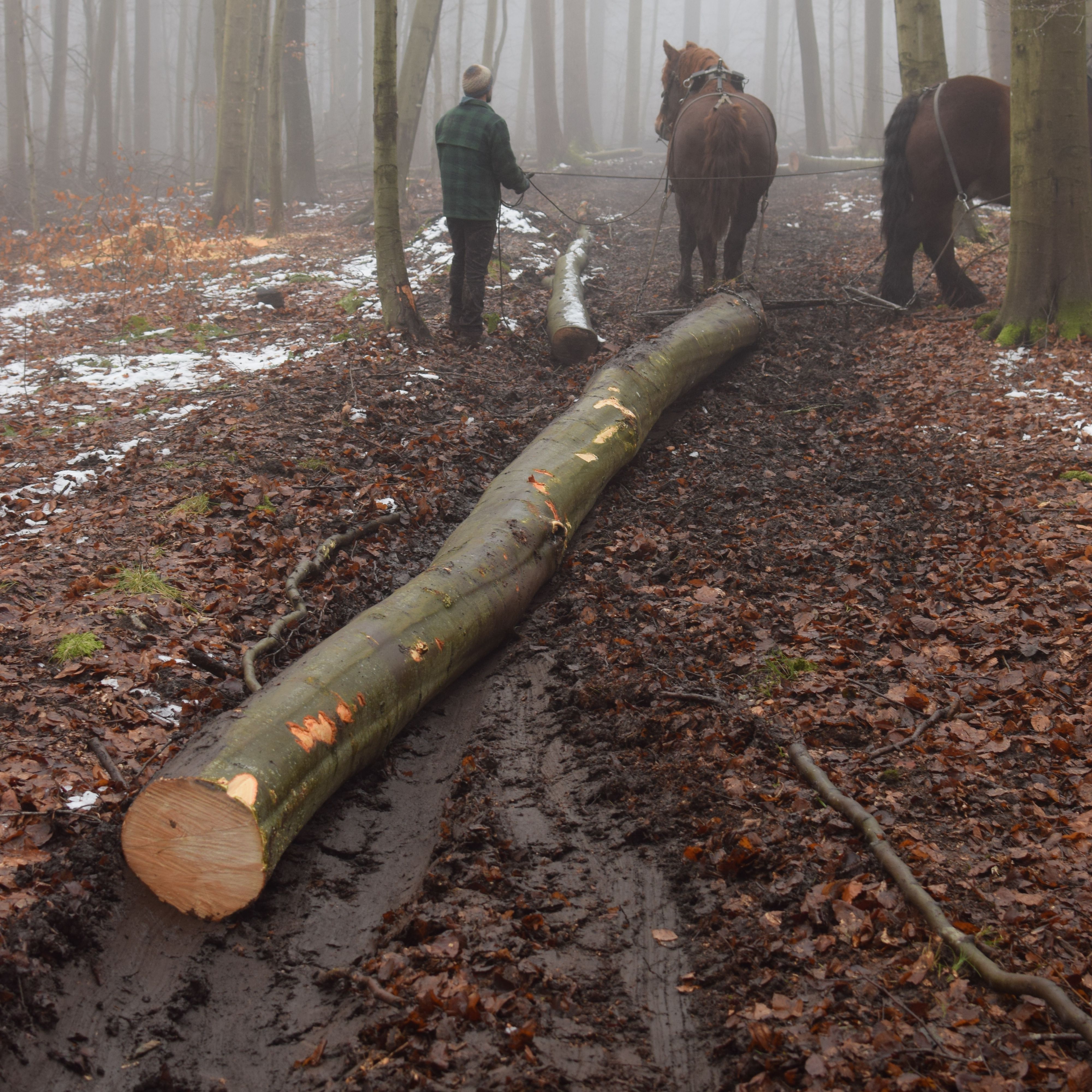 The Sonian Forest, a cold morning in January 2025. Elmo (a 5-year-old Polish cold-blood) and Fangio (a 10-year-old Ardennes horse) are doing everything they can to drag an 800 kg beech trunk from the place where it was felled to the nearest road. In contrast to plantation forestry, timber from forest maintenance is often located in areas that are very difficult to access by motorised vehicles. The use of draft horses is still the best way to move these logs without damaging the soil of the forest - keeping the tradition of horse logging alive.