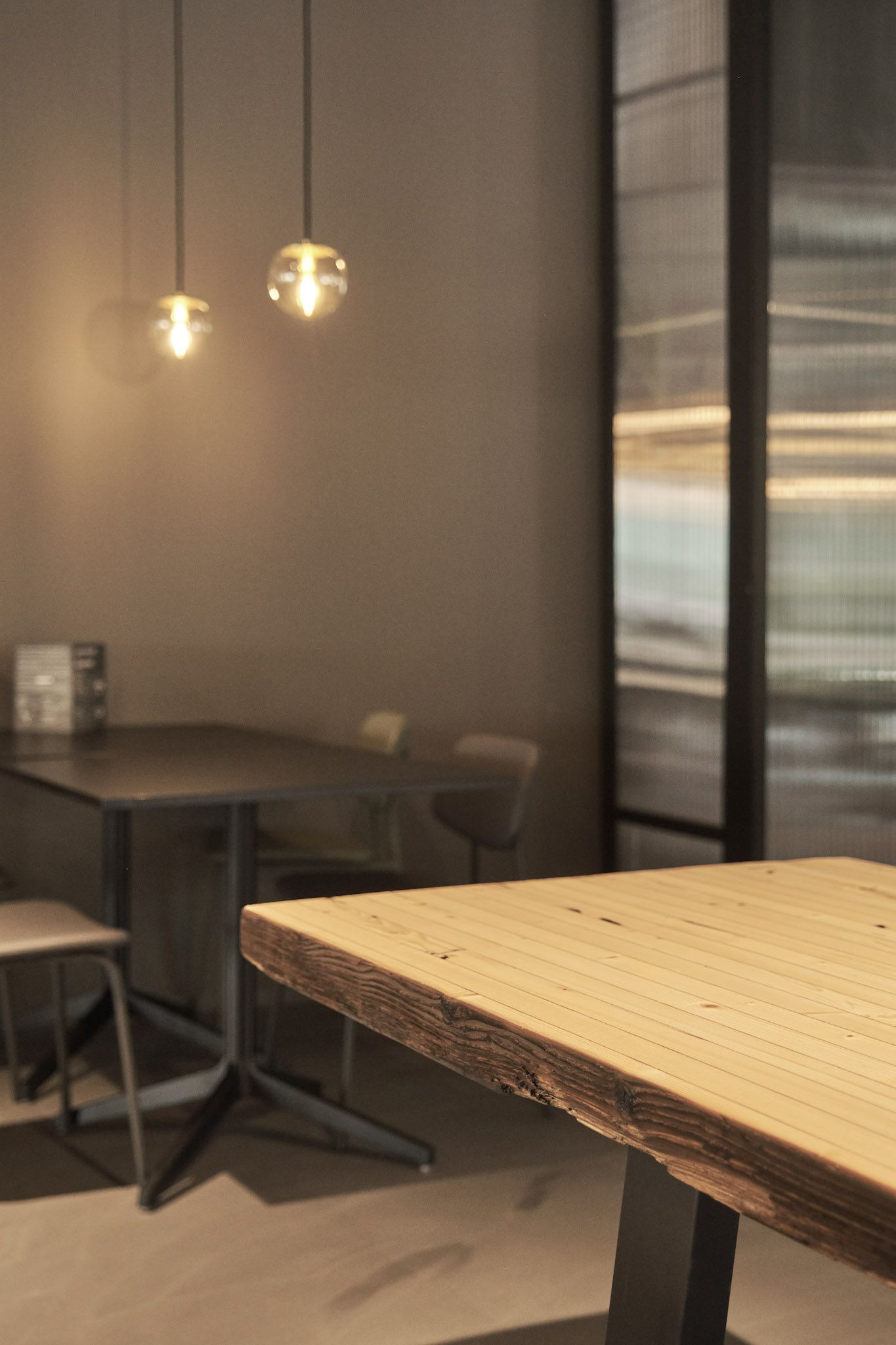 The design incorporates a lot of reclaimed materials. Notice for instance our Sybile hanging lights among other reclaimed fixtures, and the large tables made from salvaged gluelam beams.