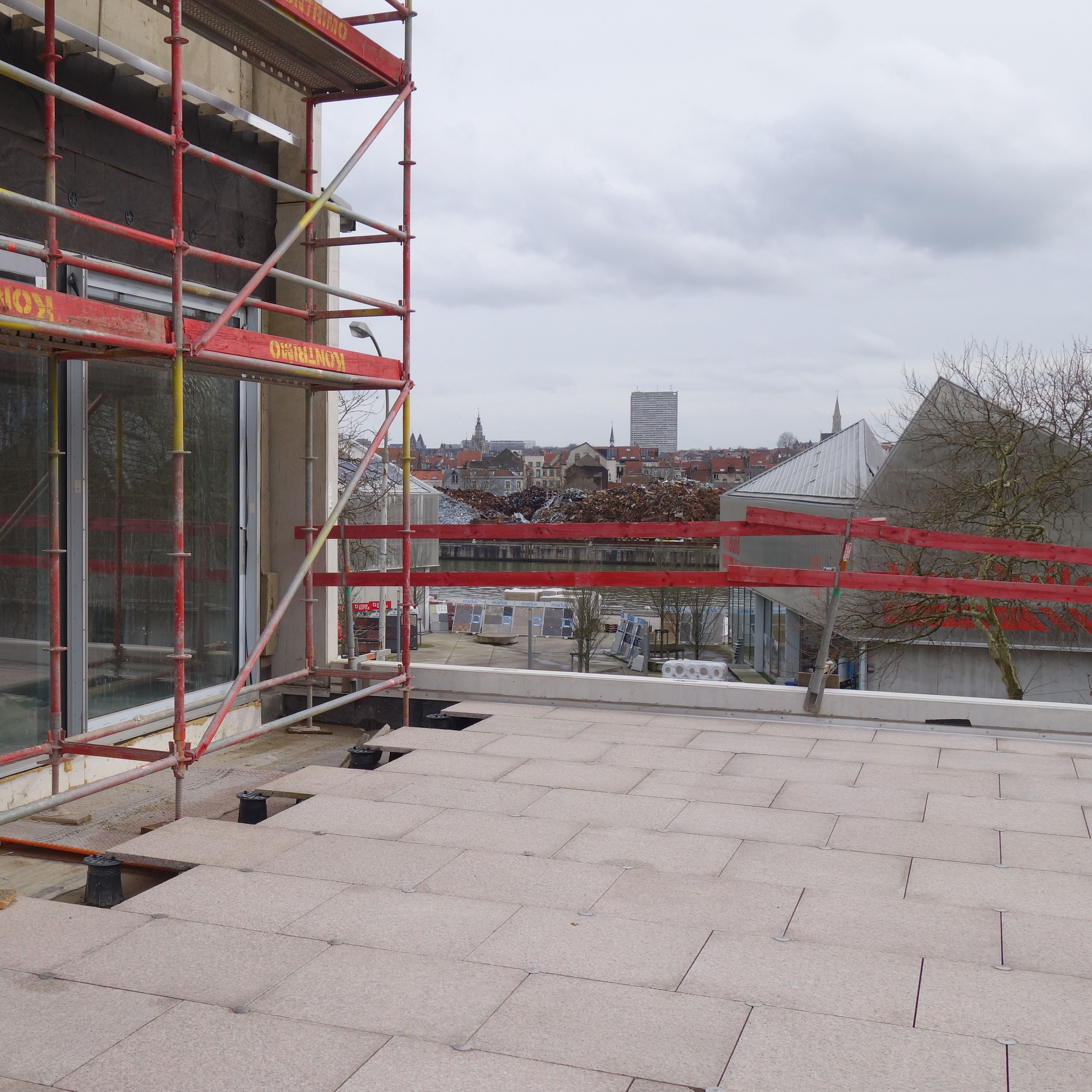 Here’s something we’re particularly proud of! Last weekend saw the opening of the new Magasin 4 concert hall on the Havenlaan in Brussels – a much-awaited moment for the Brussels rock scene. Speaking of rock, we provided over 200 m² of reclaimed flamed granite slabs for the rooftop terrace! These were originally used to clad the façade of an office building from the 1980s. The flamed finish is perfect for outdoor flooring as it is non-slip.