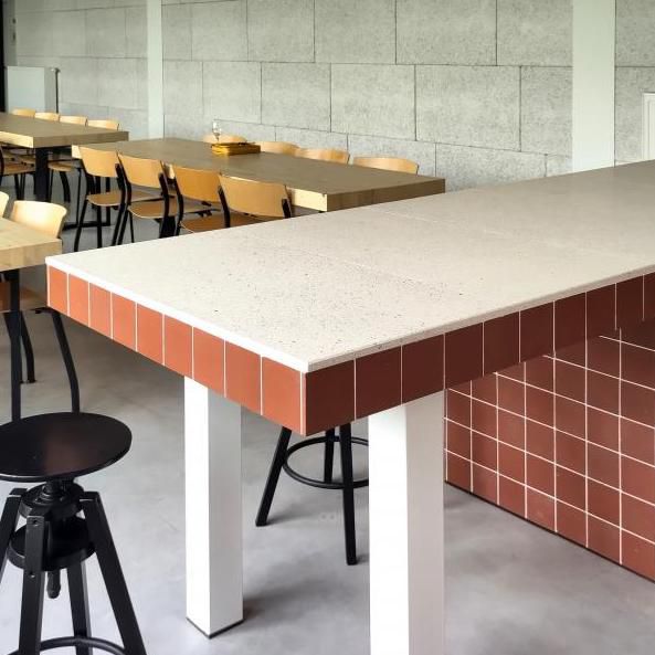 The challenges in fitting out this new space were varied: the aim was to design a bright, user-friendly space, using as much materials and furniture with a low environmental impact as possible, while at the same time giving thought to the maintenance and repair of the elements - in other words, to the entire life cycle of the interior. The materials that were chosen for the new cafetaria include reclaimed light fittings, ceramic and terrazzo tiles, armchairs, glulam table tops and cubes in corten steel from Rotor DC and reclaimed chairs from Office meubels. The elements of the existing kitchen which survived the fire were reused in-situ. The only new materials used are melamine boards for the kitchen, wooden planks as windowsills and Heraklith panels for acoustic insulation.