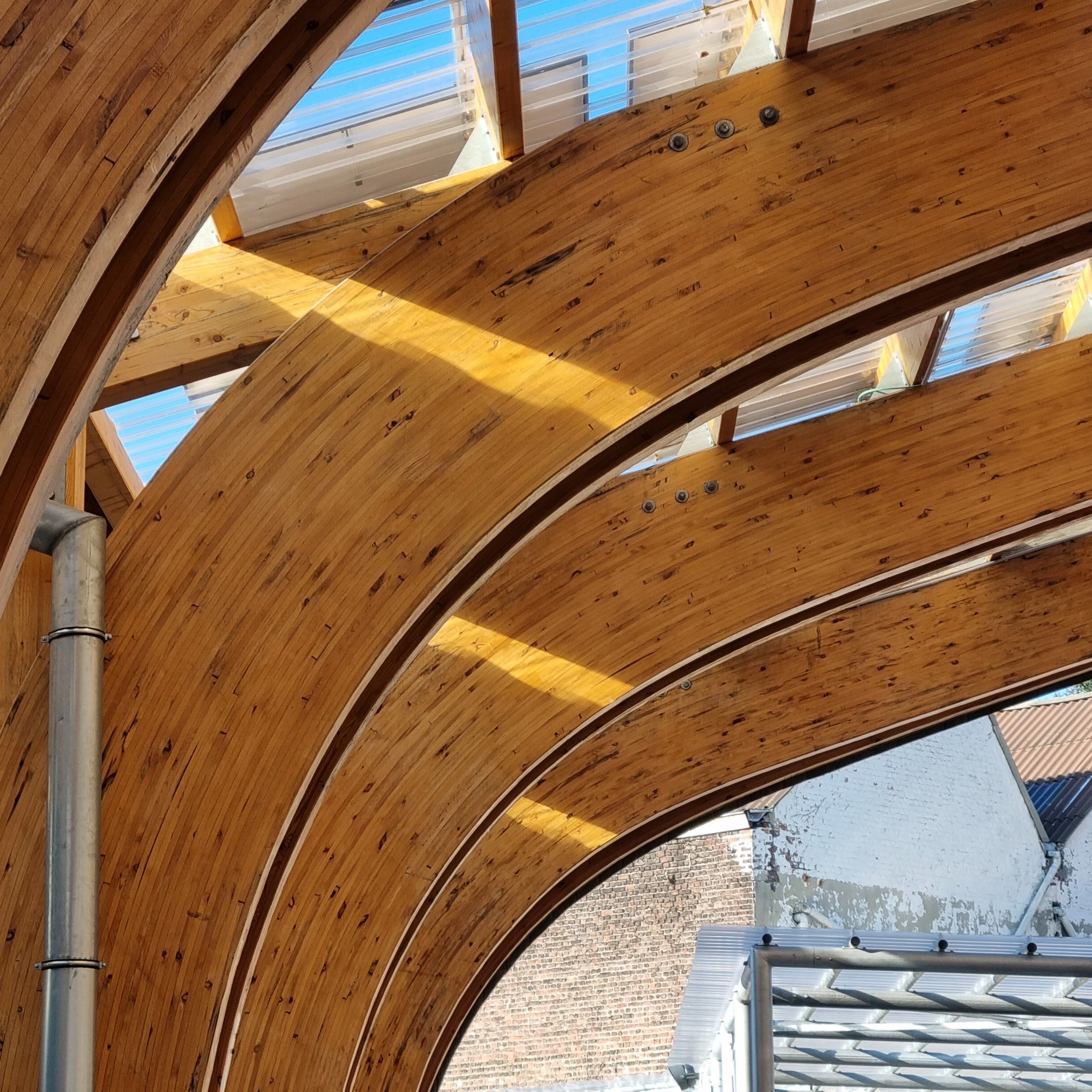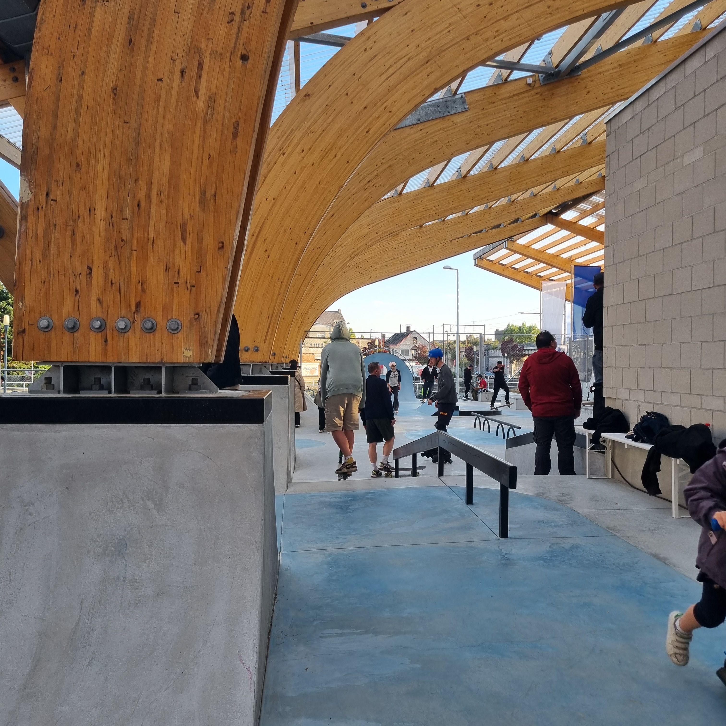Reuse at another level! This weekend saw the opening of the new 'Recypark' in Anderlecht - a place that is both a waste collection centre and a skate park (!). Also remarkable: the new wooden structure incorporates twenty massive arches in glued laminated timber, which have been salvaged from a former horse riding school in Liège.