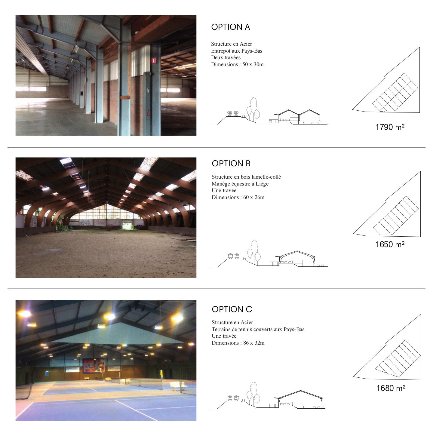 Demolition firm Stallaert signaled a wooden structure that proved suitable for the project. As the riding school was located on a plot of land belonging to the Liege airport, it was acquired through an atypical purchase procedure between two public bodies. The arches were then stored in a hangar in Nivelles and subjected to inspections and tests to make them acceptable from a structural engineering point of view. This included mechanical tests in a laboratory to check the strength of the wood. Design strategies also helped to mitigate the risk, notably by reserving salvaged elements for less demanding parts of the structure (the half of the arches are new), designing specific reinforcements and over-dimensioning.