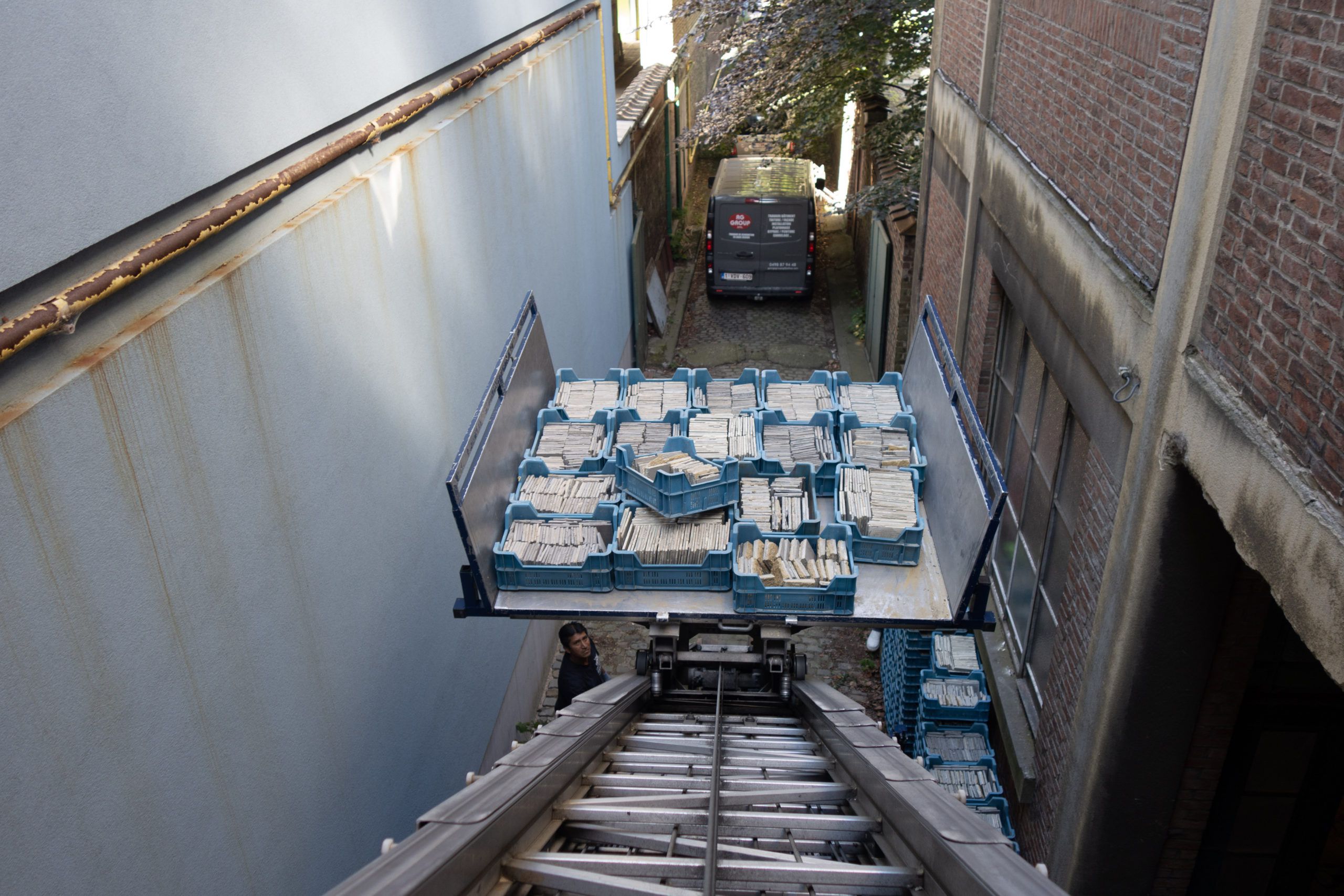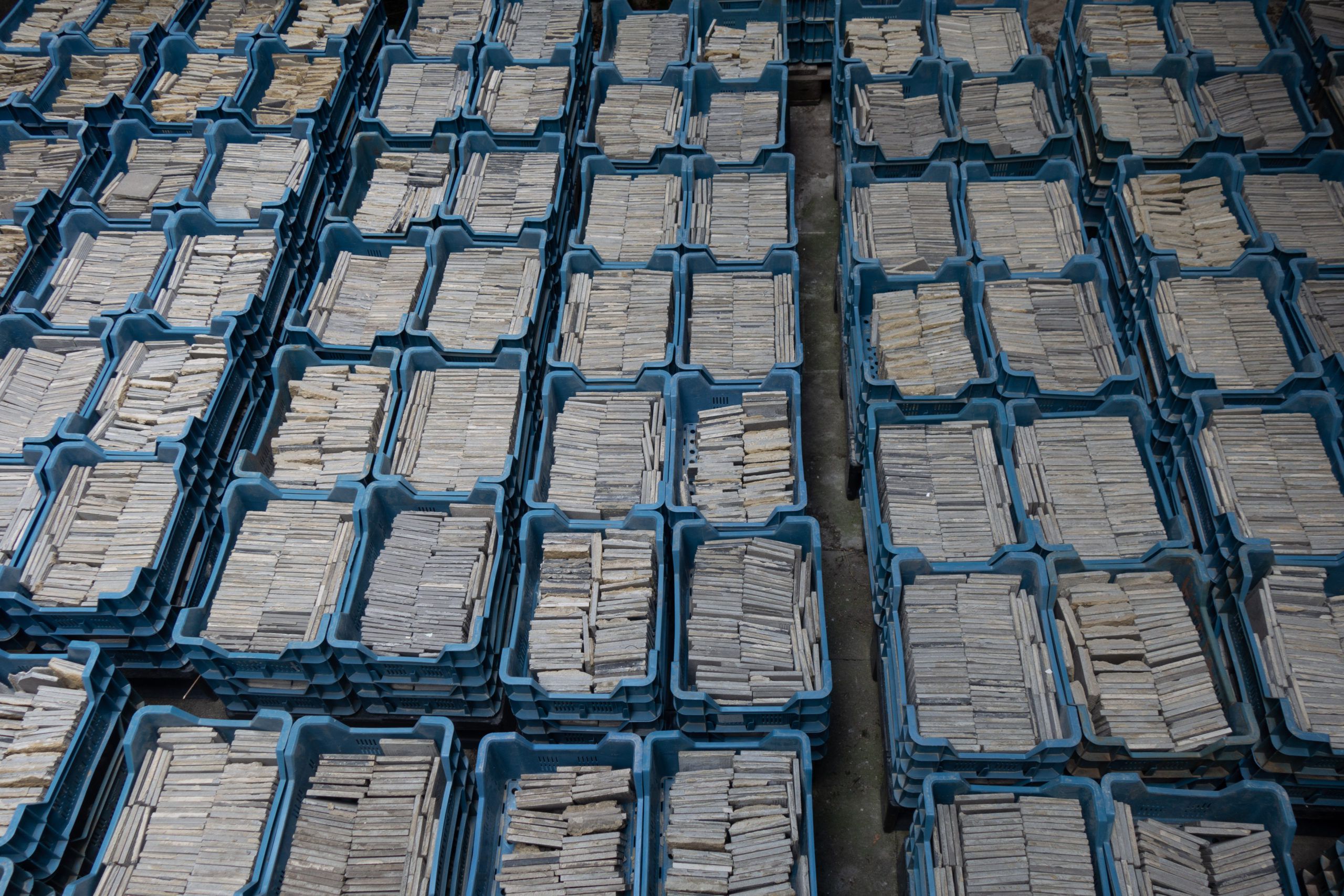 To remove the mortar from the tiles, we’re making use of a specifically developed installation that uses a biological acid. The process, that uses only rainwater for rinsing, was found by an independent assessment to be 85% less harmful to the environement as the fabrication of an equivalent new product.