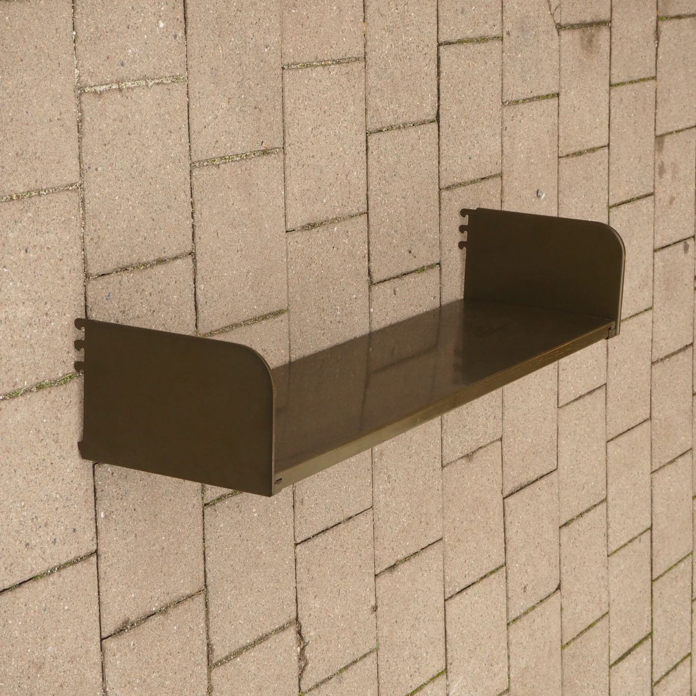 The shelves are sold in parts and can be assembled according to your needs to create a modular shelving system (see pictures of the original unit combinations). The shelves were originally fixed in the concrete floor and on the ceiling. A custom mounting system (wall, standing, ceiling) and small adaptations will be needed depending on your interior project.