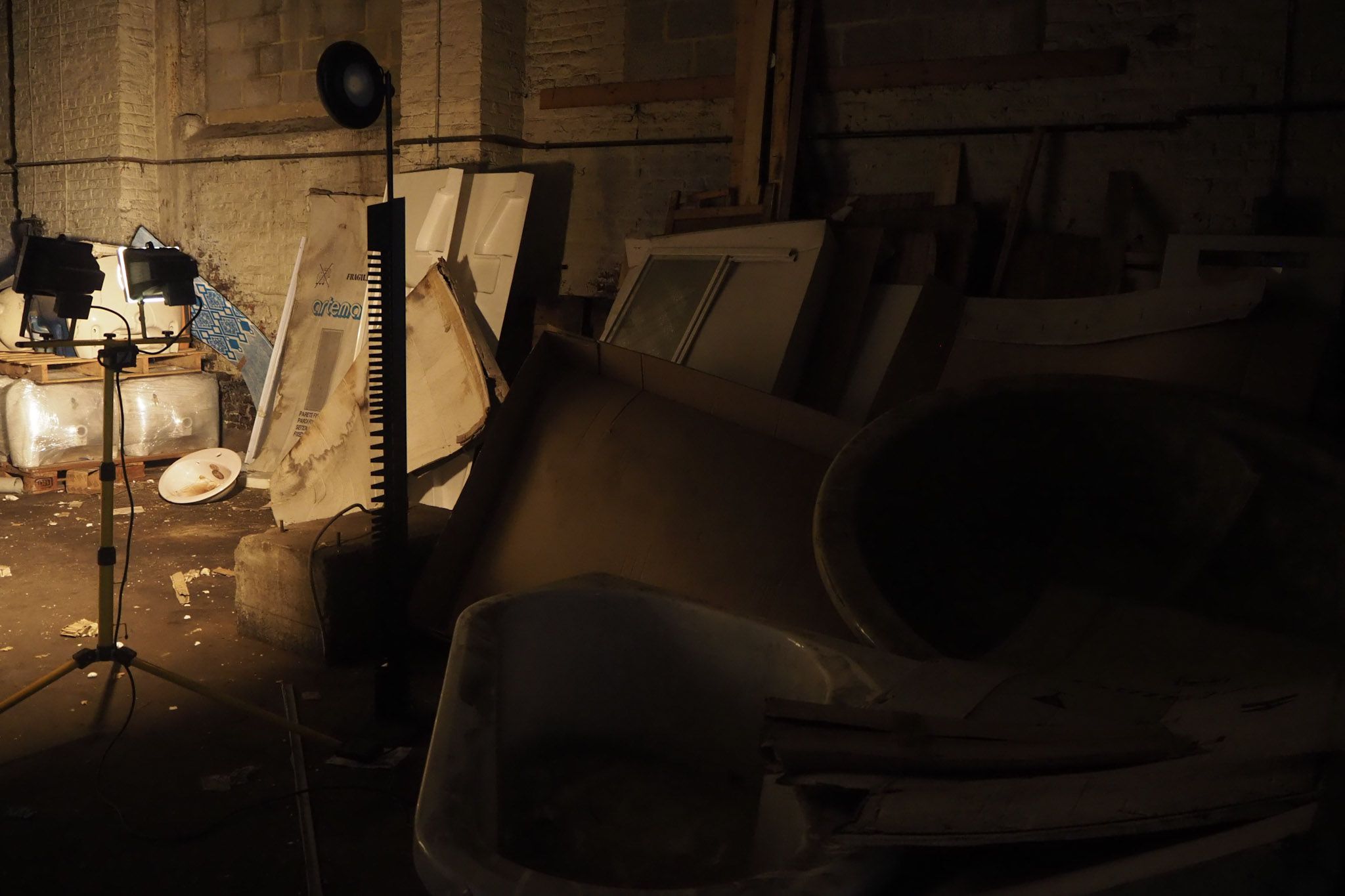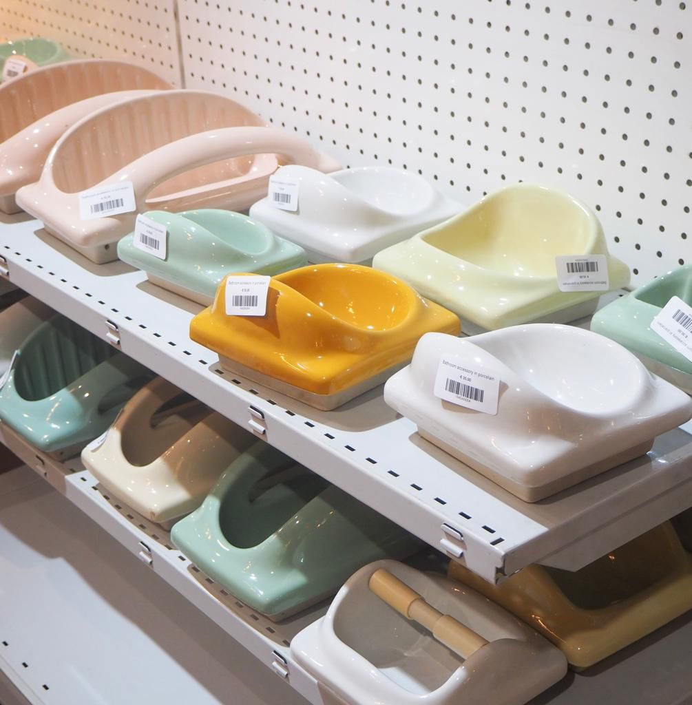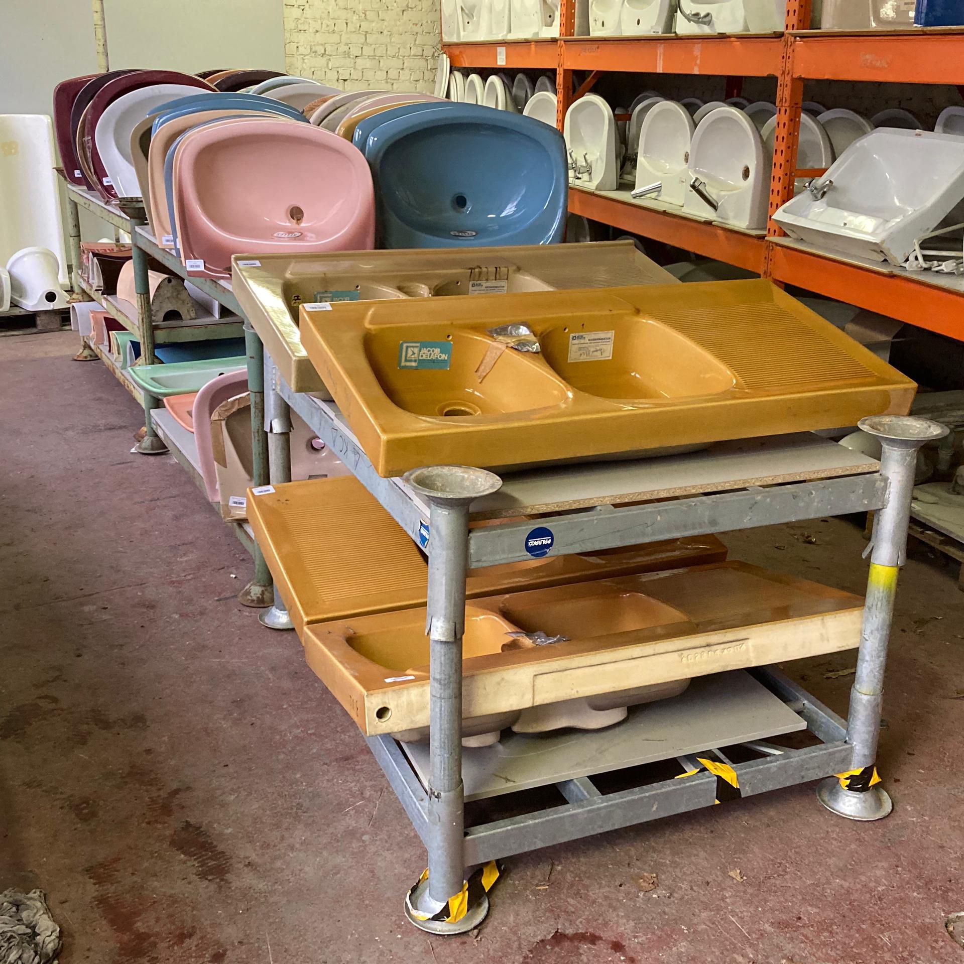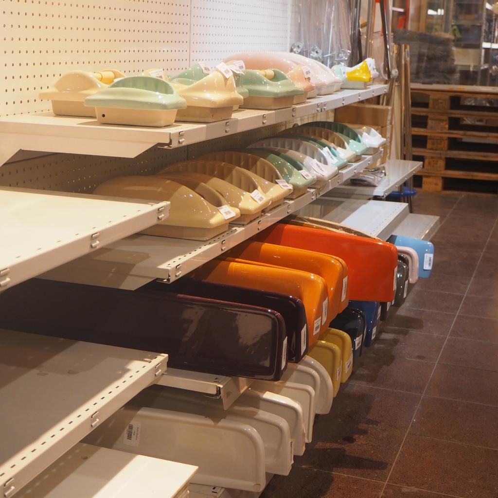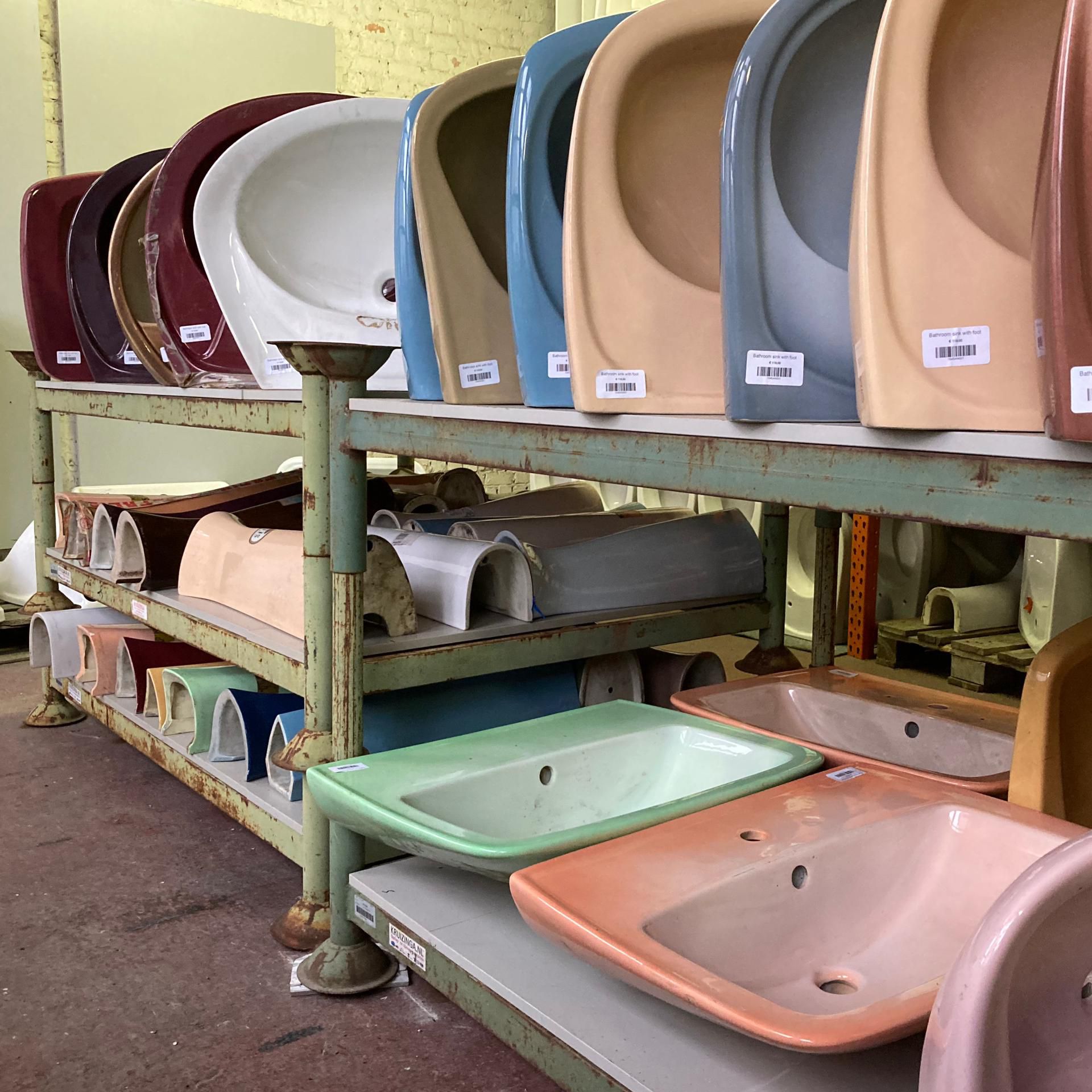 In a factory building that will be reconverted, we found a stock holding hundreds of sinks and bathroom accessories in porcelain. A wide range of beautiful colours remind of those days when bathrooms were expressive and fun.
